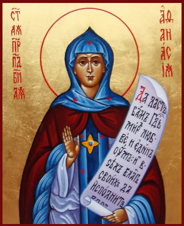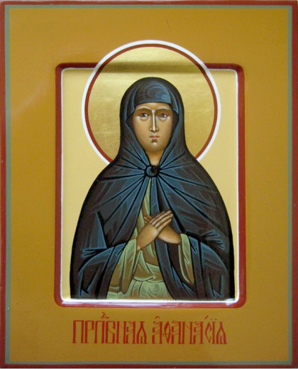 Ты же, блаженная Афанасия, почтенная именем бессмертия, сожительница Божественных Ангелов и Евангельски ради Христа обнищавшая, и обогатившаяся Божественными дарами, всегда плакавшая и ничем не нарушимое утешение обретшая, в жажде и алчбе временную жизнь проводившая и вечное блаженство получившая, к нищим милостивая и от Бога помилованная, ты, за чистоту сердечную приявшая свет Святого Духа и мир в душу свою, соделавшаяся храмом Святого Духа и сокровищницею добродетелей на земле, за что и сподобилась неизреченного прославления на небеси, ты, водворившаяся в сонме святых и разделяющая блаженство с ними, помяни и нас, восхваляющих твое добродетельное житие и с радостью духовною почитающих твою память. Призри на житие наше, проводимое среди мятежных мирских волн, чтобы молитвами твоими праведно поживши, мы избежали диавольских сетей и сподобились вместе с тобою вечного блаженства благодатью Господа нашего Иисуса Христа, с Ним же Отцу и Святому Духу слава, честь и поклонение, и ныне и присно и во веки веков. Аминь.