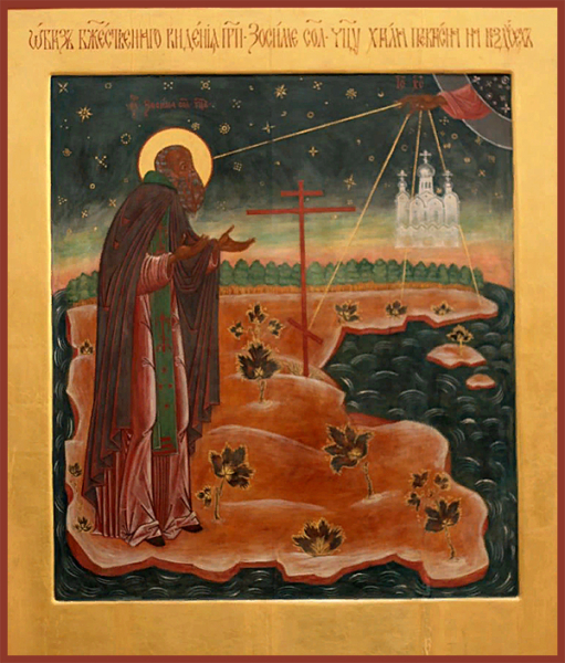 Преподобный Зосима, игумен Соловецкий, великий светильник русского Севера, основатель иноческого общежития на Соловецком острове, родился в Новгородской епархии, в селе Толвуе близ Онежского озера. С юных лет он воспитывался в благочестии и после смерти родителей Гавриила и Варвары раздал имущество и принял постриг.