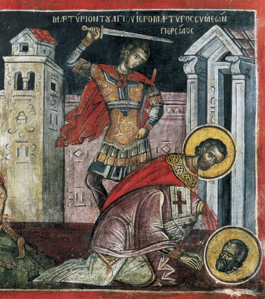 Священномученик Симеон, епископ Персидский, пострадал во время гонения на христиан от Персидского царя Сапора II (310–381). Он был епископом города Селевкии – Ктезифона. Святителя оклеветали в связях с Греческим государством и враждебных действиях против Персидского царя.