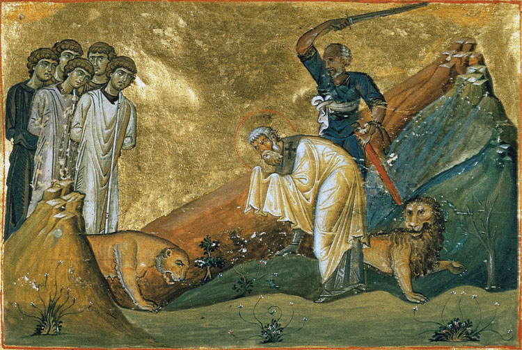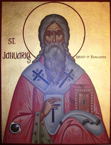 Св. Иануарий, бывший епископом в Кампанийской области в Италии, был во время гонения при Диоклитиане предан истязаниям за веру Христову. Но вот, брошенный в раскалённую печь, он выходит из неё невредимым... Выведенный на следующий день на съедение зверям вместе с другими христианами: Прокулом и Соссием, Фавстом и Десидерием, клириками в г. Путеолах, и мирянами: Евтихием и Акутионом – Иануарий и дружина его остаются неприкосновенными: звери с кротостью припадают к ногам епископа к общему изумлению бесчисленной толпы народа...